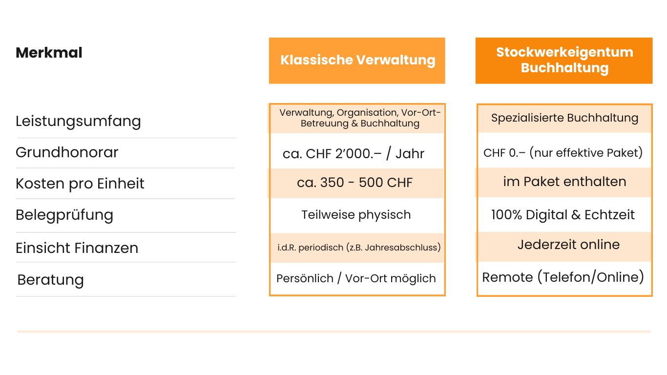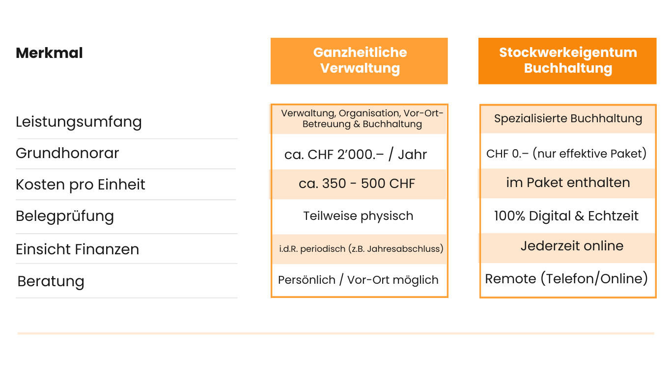 Während eine ganzheitliche Verwaltung neben der Buchhaltung auch Administration, Organisation, Vor-Ort-Termine und Koordination übernimmt, konzentrieren wir uns bewusst auf einen Bereich: die professionelle Stockwerkeigentum-Buchhaltung.